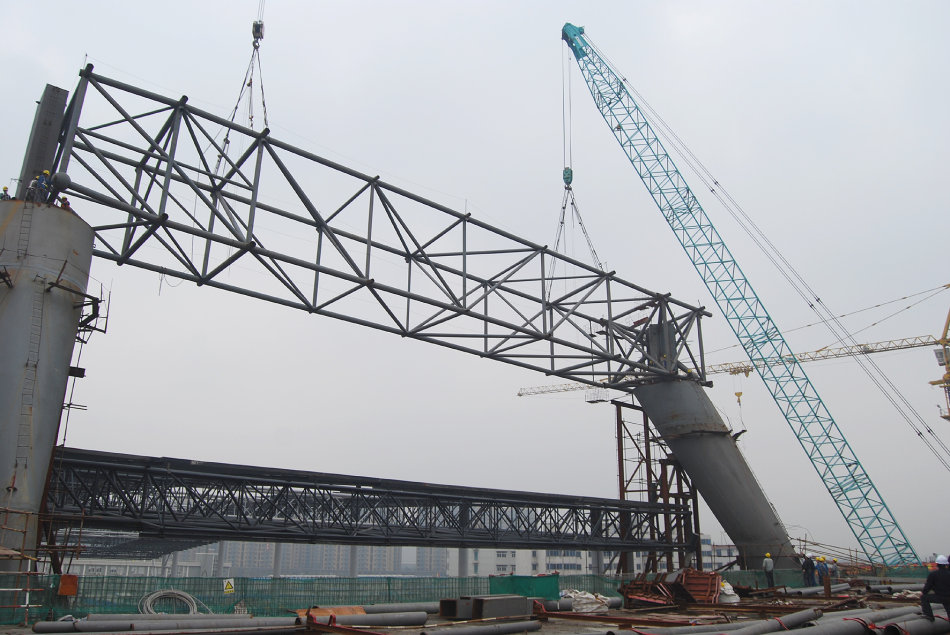 2、屋蓋構(gòu)件吊裝,及時(shí)進(jìn)行固定并按好屋面支撐系統(tǒng),以保持結(jié)構(gòu)穩(wěn)定。